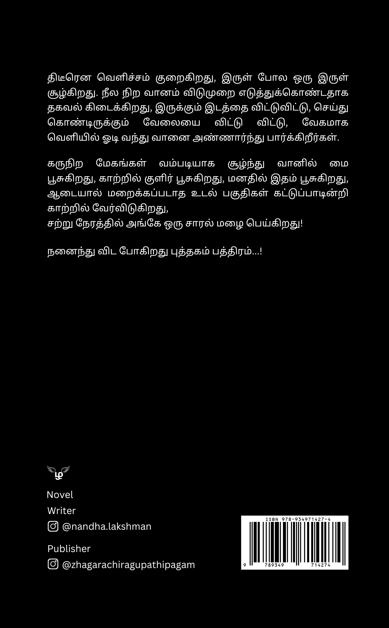 கருநிற மேகங்கள் வம்படியாக சூழ்ந்து வானில் மை பூசுகிறது, காற்றில் குளிர் பூசுகிறது, மனதில் இதம் பூசுகிறது, ஆடையால் மறைக்கப்படாத உடல் பகுதிகள் கட்டுப்பாடின்றி காற்றில் வேர்விடுகிறது,
